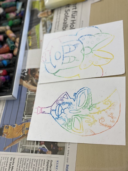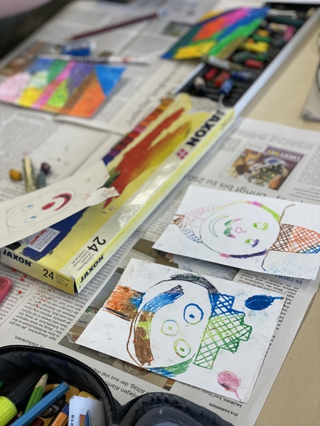Die 3B-Klasse bereitet sich auch im Zeichenunterricht auf den Fasching vor. Die kleinen Kunstwerke in Ölpastell sind in der Klassengalerie ausgestellt.